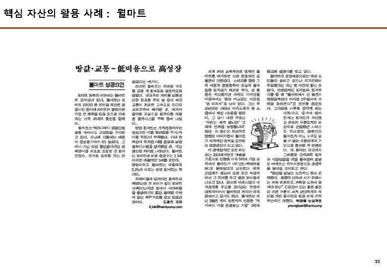 핵심 자산의 활용사례 : 월마트 2006 EMBA 월마트의 원가 경쟁력 (% of Sales) Cost Drivers Cost Item • Store Rental Expense 0. 3 • Store Location • Advertisement Expense 1. 2 • Brand Reputation • Payroll Expense 1. 1 • Employee Loyalty • Shrinkage Expense • Distribution Expense 0. 7 1. 2 • Distribution/ Logistics System Total Advantage: 4. 5% Source: D. Collis, Corporate Strategy, 1997. 34