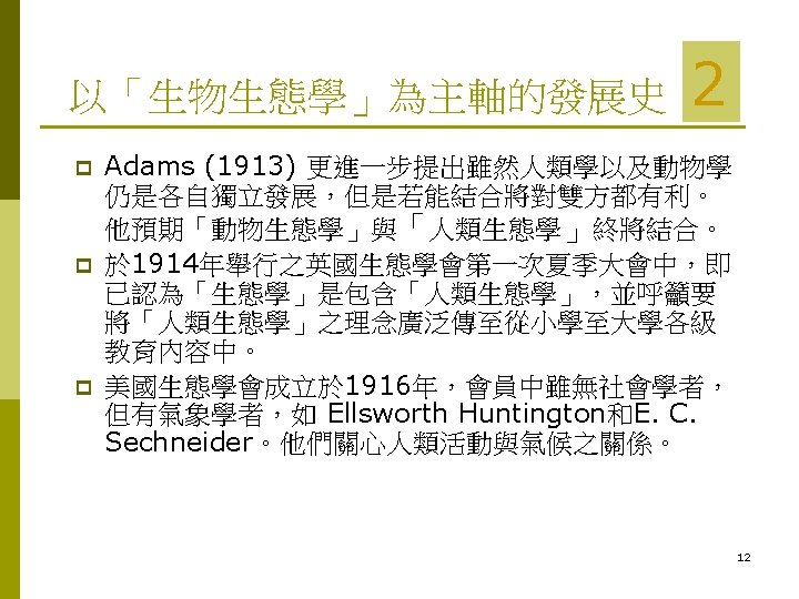 ………. . (by 1910 s) p 1893 J. S. Burdon-Sanderson: President, p British Ass. for Advancement of Science. n 將 Ecology 成為「生物學」中三大部之一。 n ecology, physiology and morphology n 生態學 = philosophy of living nature. 1900 s Clements & Cowles:Plant ecology n 生態學 = 生理學 1910 s Adam (1917) & Elton (1927) :Animal ecologists n 生態學= new natural history (Adam, 1917) = scientific natural history (Elton, 1927) p 11