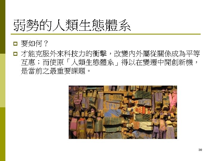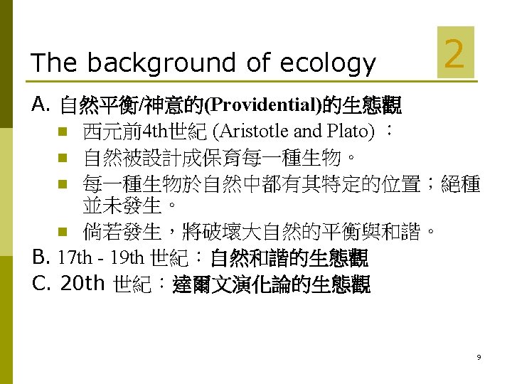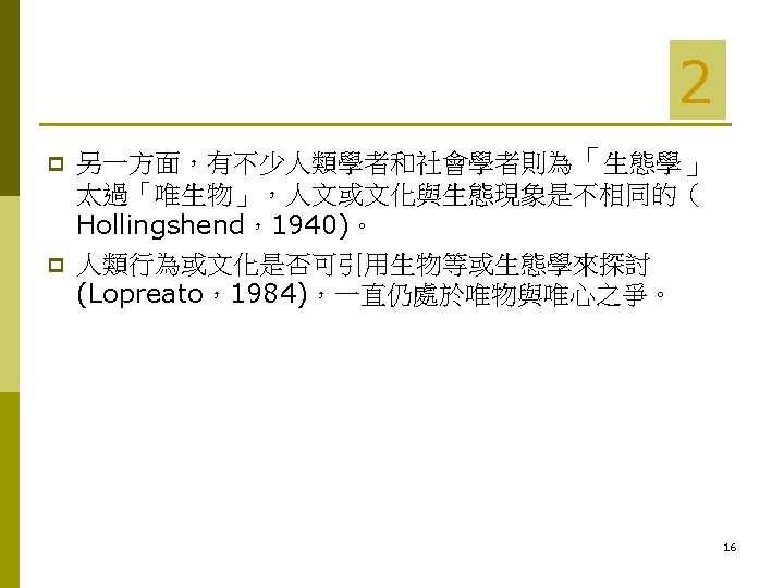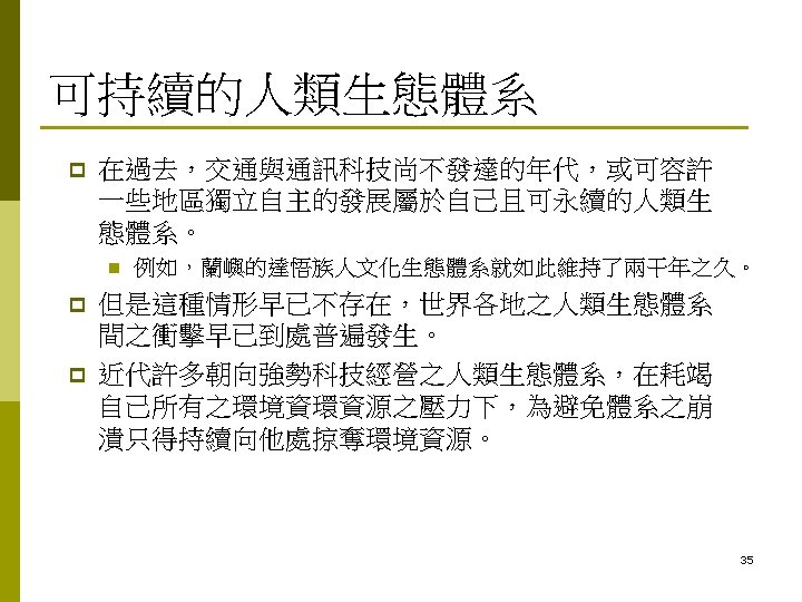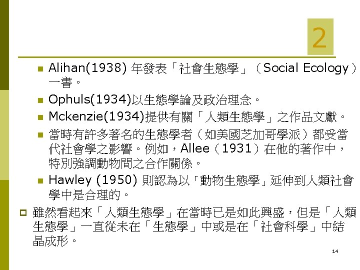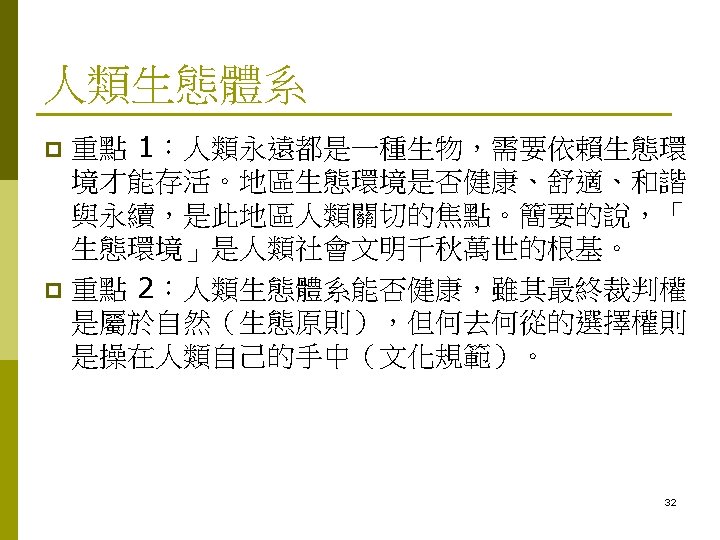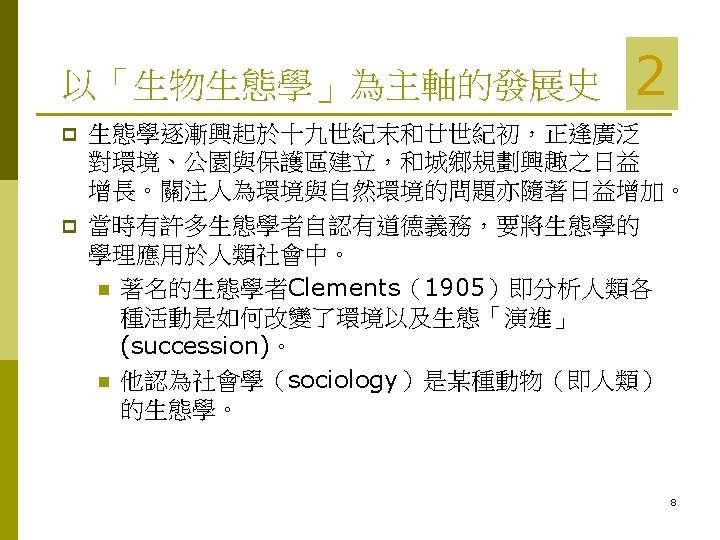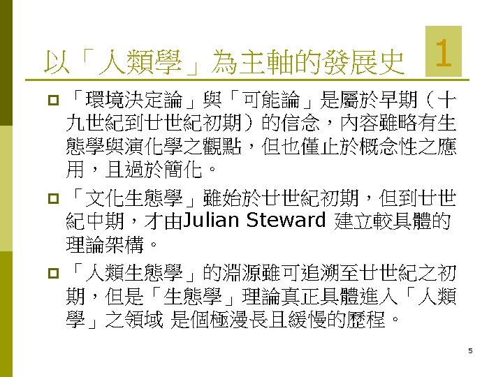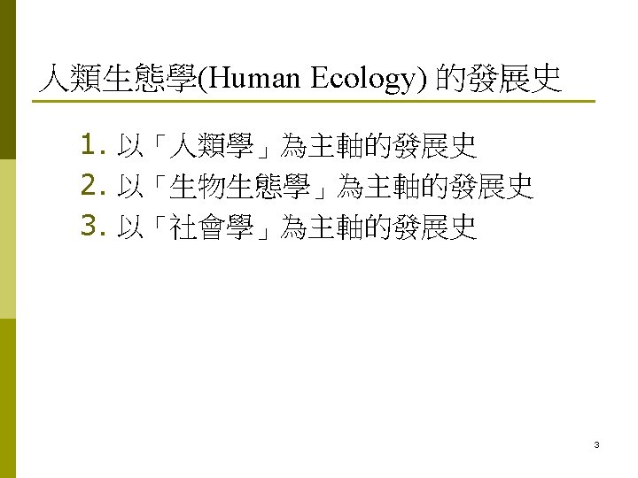 Contents 人類生態學 (Human Ecology) 的發展史 p What is Human Ecology? p Human Ecosystems (人類生態體系) p 2