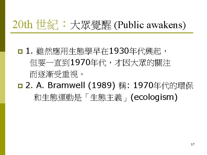 大眾覺醒 (Public awakens) p 3. 人和環境相關的研究,追溯至 1800年代。 n n n G. P. Marsh (1864): Man and Nature. E. Haeckel (1900): The Riddle of the universe. (1905): The wonders of Life. /back-to-the-land movement /有機農業/土壤和森林保育 J. Ritchie (1920): The influence of man on animal life in Scotland. 18
