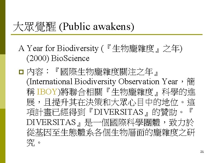 3. 人和環境相關的研究 n n n P. Shepard and D. Mc. Kinley (1969): The subversive Scinece. E. Callenbach (1970): Ecotopia. D. H. Meadows, D. L. Meadows, J. Randers, and W. W. Berhens III (1972): The limits to growth. IUCN (1980): World Conservation Strategy. Council on Environmental Quality (1980): Global 2000 20