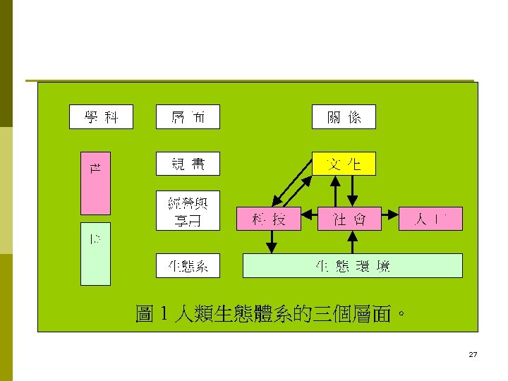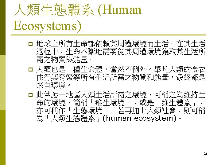 What is Human Ecology? Human ecology is about relationships between people and their environment. p In human ecology the environment is perceived as an ecosystem(生態體系). p 25