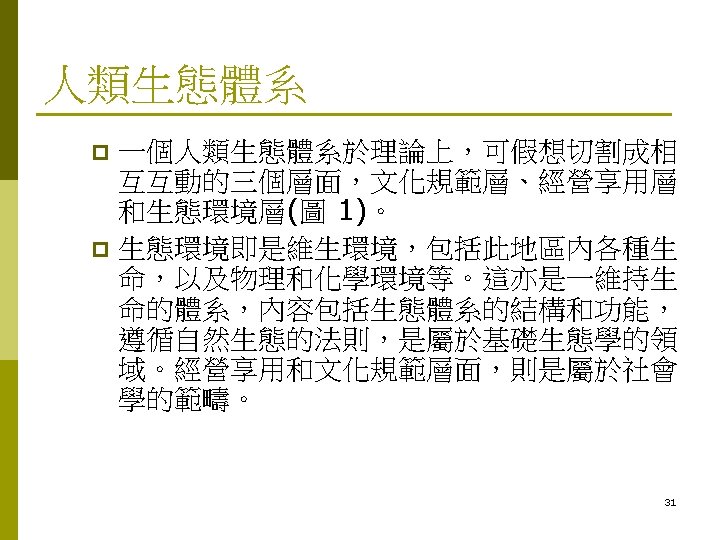 Human Ecology p p p Introduction Populations and feedback systems Human population Ecosystems and social systems as complex adaptive systems Ecosystem organization Ecological succession p p p Coevolution and coadaptation of human social systems and ecosystems Ecosystem services Perceptions of nature Unsustainable humanecosystem interaction Sustainable humanecosystem interaction Examples of ecologically sustainable development Marten. G. G. 2001. Human Ecology: Basic concepts for sustainable development. Earthscan pub. Ltd. 30