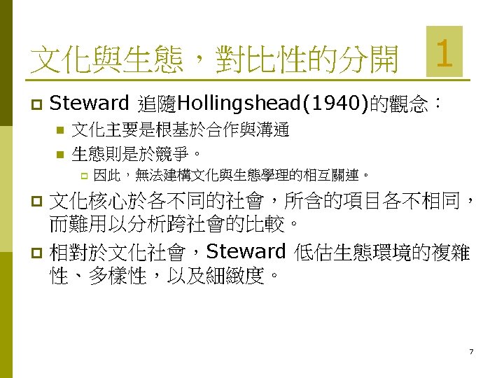 Julian Steward 的文化生態學 p 1 「文化生態學」 (Cultural Ecology)有七項重點: n n 文化核心(cultural core)、環境與文化間的相關、 線性互動的關聯、功能與適應、 引入生態學理、了解生態的複雜性、 以及歷史的變遷。 Julian Steward(1955) The theory of cultural change. p 其他還有:Freilich (1963), Harris (1968), Rappaport (1963, 1968, 1969, 1971)等學者 p 6