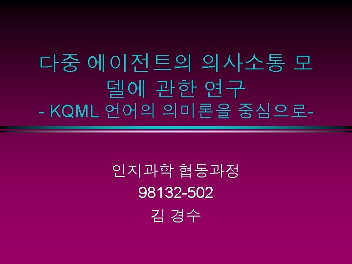 Contents l l Agent Communication and Language KQML(Knowledge Query and Manipulation Language) features A KQML Message n KQML Performatives n l l Communication Models of KQML Agent Framework for Semantics KQML Implementation Conclusion