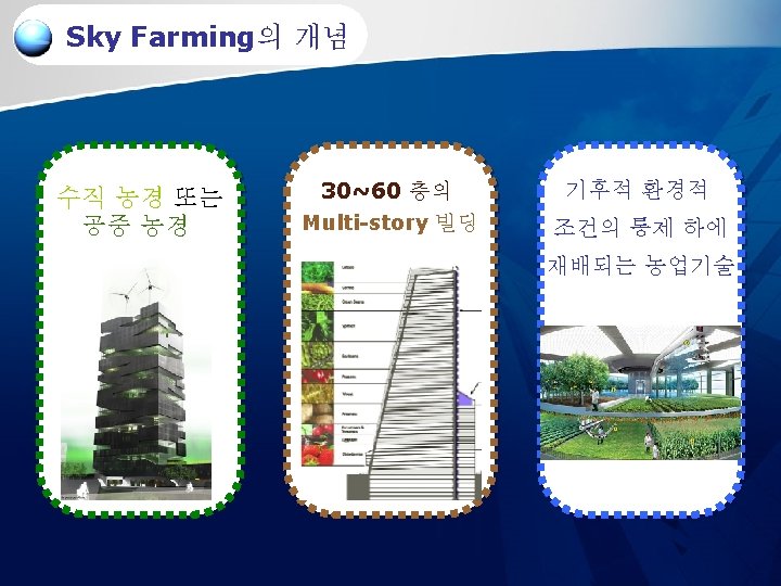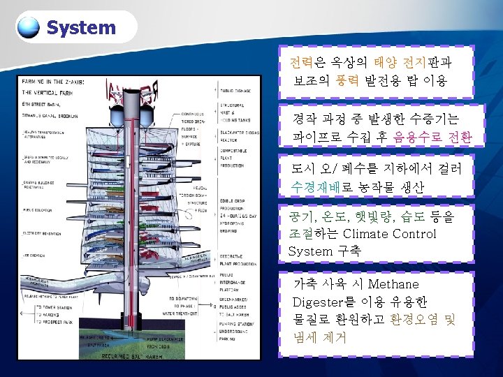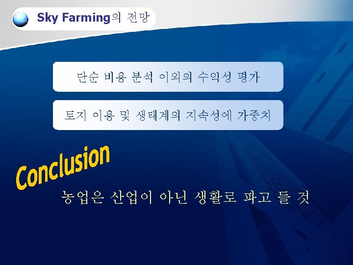 CONTENTS sky farming sky farming sky farming system Slides: 12 Download presentation CONTENTS 농업 생산의 제약 요소 미래 농업 sky farming 개념 sky farming 의 장점 sky farming system 의 특징 비용분석 Sky Farming 구조 설계도 비용 및 이윤 추산 TABLE 2. Estimated Net Profit REVENUES & EXPENSES (1 st Year of Full Output) REVENUES Total Revenues @ $1. 60 / head $18, 605, 000 Total Labor Costs (includes benefits + insurance) EXPENSES -$2, 135, 000 Total Electricity Costs @ 95% Biogas reliability -$130, 000 Total Electricity Costs @ 5% extreme climate conditions -$100, 000 Production Supplies -$700, 000 Modified Atmosphere Packaging -$500, 000 Biogas + Living Machine Operational Costs -$650, 000 Building and Facilities Maintenance (0. 75% per year) -$628, 000 Office Operational Costs -$200, 000 Total EBIT (Earnings before income taxes) Net Profit (after 10% income tax) $18, 605, 000 $13, 562, 000 $12, 206, 000 -$5, 043, 000 Q&A