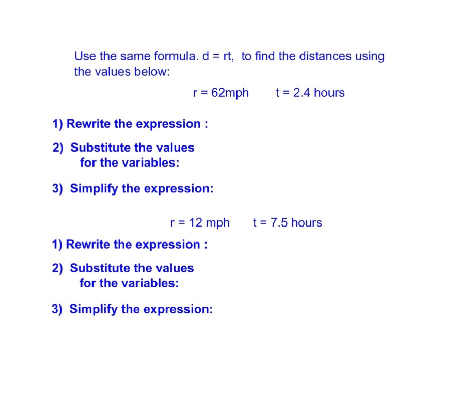 Find the distance using the formula d = r t Given a rate of 75 mph and a time of 1. 5 hours. 1. ) Rewrite the expression : d = r t 2. ) Substitute the values for the variables: d = (75) (1. 5) 3. ) Simplify the expression: d = 112. 5 miles