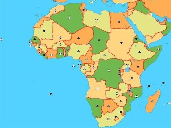 POPULAÇÃO • Agrupados principalmente no norte da África, vivem 5 milhões de brancos de origem européia. • Em meados da década de 1980, a população total era estimada em 550 milhões, o que equivale a 11% da população mundial. • A densidade demográfica média, cerca de 18 hab/km 2, inclui grandes áreas desérticas que são praticamente desabitadas. • As áreas mais densamente povoadas são as costas setentrionais e ocidentais, as bacias dos rios principais e o planalto oriental.