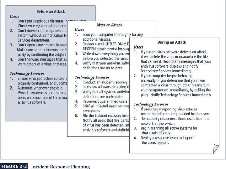 Before the Incident n n Planners draft a third set of procedures, those tasks that must be performed in advance of the incident Include: n n n Details of data backup schedules Disaster recovery preparation Training schedules Testing plans Copies of service agreements Business continuity plans