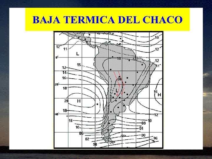 LA BAJA DEL CHACO • Sistema de baja presión en superficie, se centra principalmente al sur de Bolivia y el norte de Argentina, es de origen térmico. • Es profunda en verano y se presenta debilitada en primavera y otoño, generalmente desapercibida en invierno.
