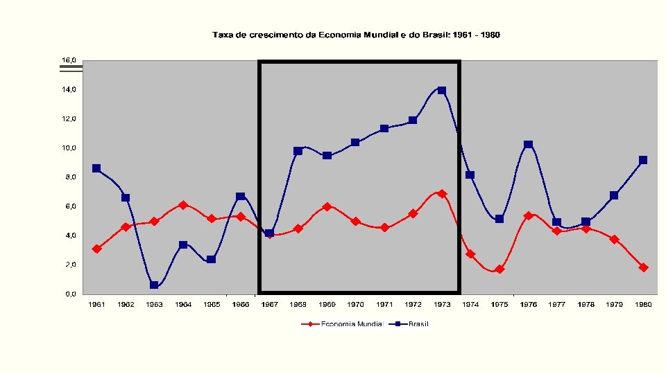 24 § Período 1968 -73: § maiores taxas de crescimento do produto brasileiro na história recente § taxa média acima de 10% a. a. § Ampliação da formação bruta de capital § Taxa de inflação relativamente “controlada” § Problemas de balanço de pagamentos pequenos