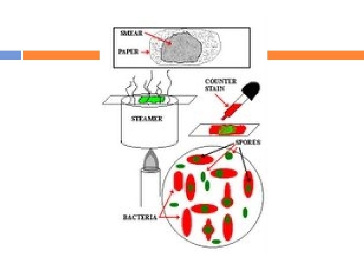 Staining Endospores cont. . Safranin: Once the endospore is stained, the counter stain, Safranin, provides color for the vegetative (i. e. metabolically active) cells.