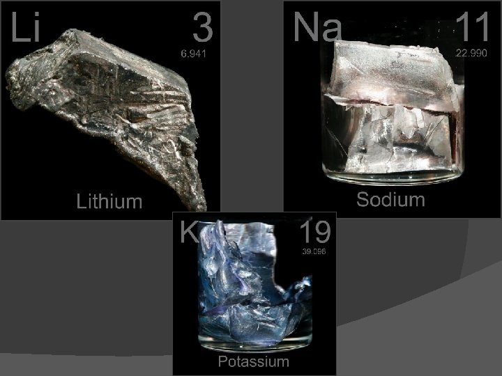 Alkali Metals � Group 1 (excluding hydrogen) � HIGHLY reactive �Reactivity increases as you move down � React with oxygen and water � Low melting points (below 200ºC) � Soft (can be cut with a knife) �Cesium is softer/more reactive than lithium