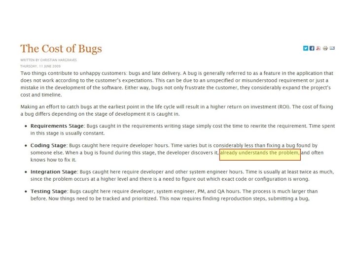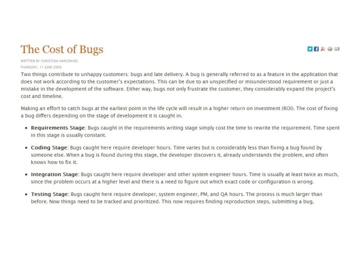 Where does testing happen? • Testing isn’t just done in QA • Be aware of the cost of fixing a bug