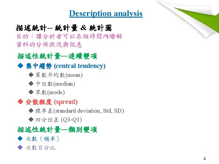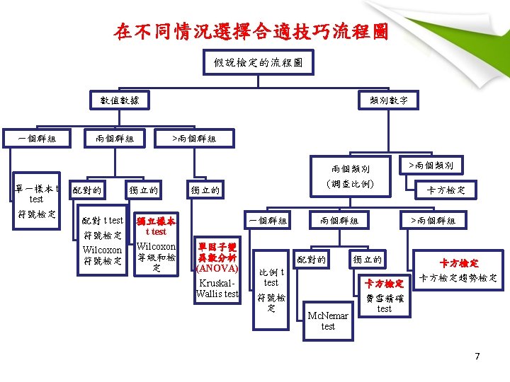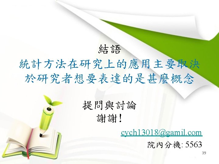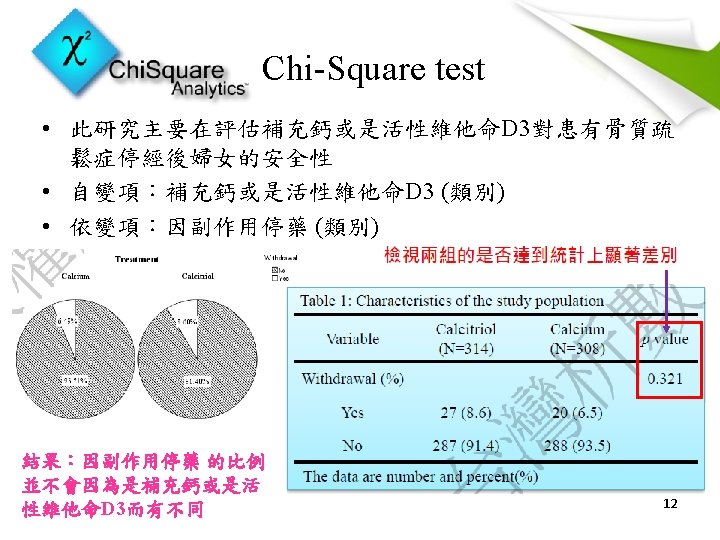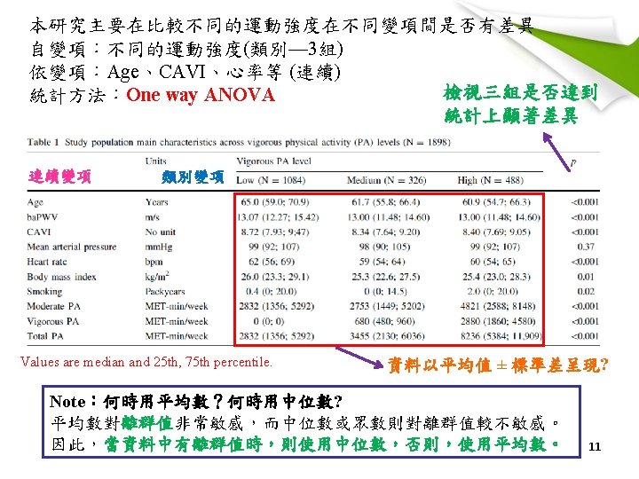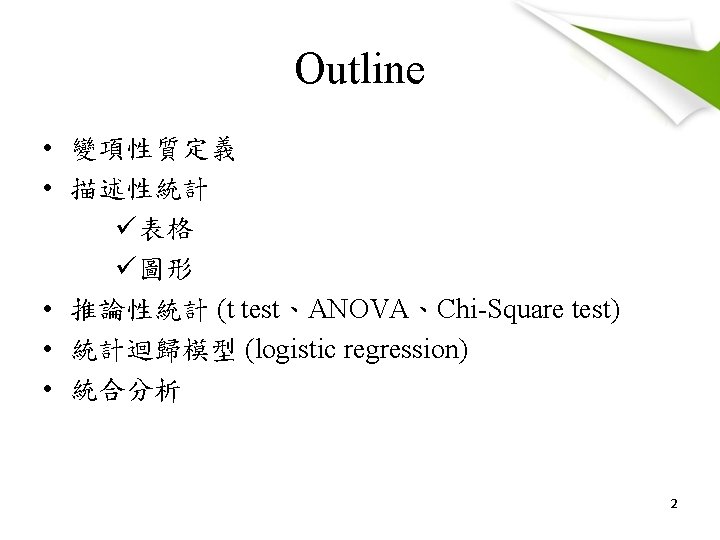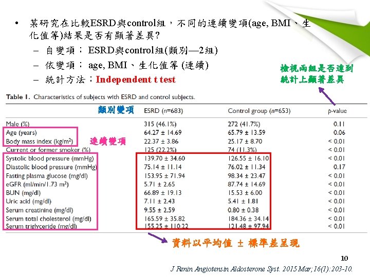 論文中常用的統計分析方法 Continuous variable Categorical variables • 兩組獨立樣本檢定 • 關聯性檢定 – Chi-Square test – T test • 兩組配對樣本檢定 – Paired t test • 三組獨立樣本檢定 – ANOVA – Mcnemar’s Test 9