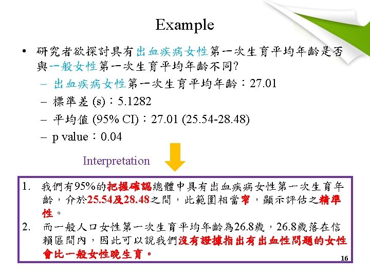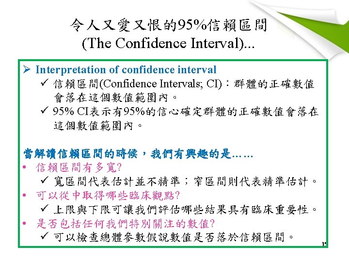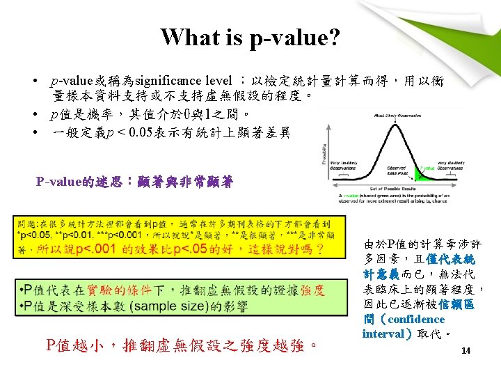 Group (independent variable) 2組樣本t test, P < 0. 05表示有顯著 差異 (2組年齡平均值 不一樣) 卡方檢定, P < 0. 05表示有顯著 差異 (2組有DM的 比例不一樣) 主要比較有depressive symptoms與沒有 depressive symptoms的 CAD patients在不同變項 間有無差異 What is p-value ? 13