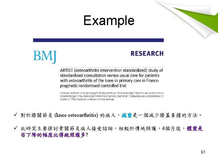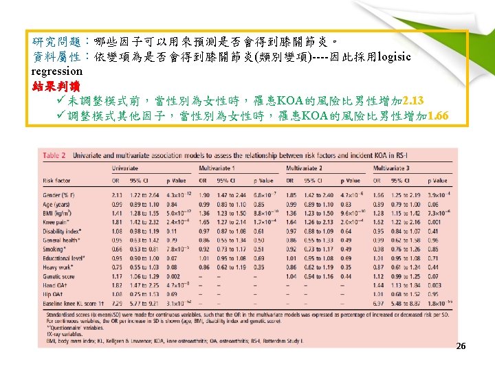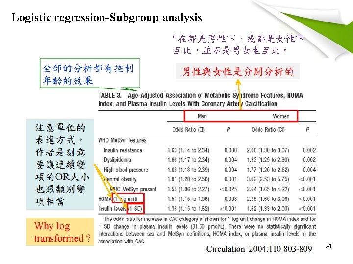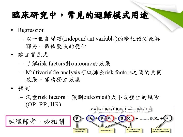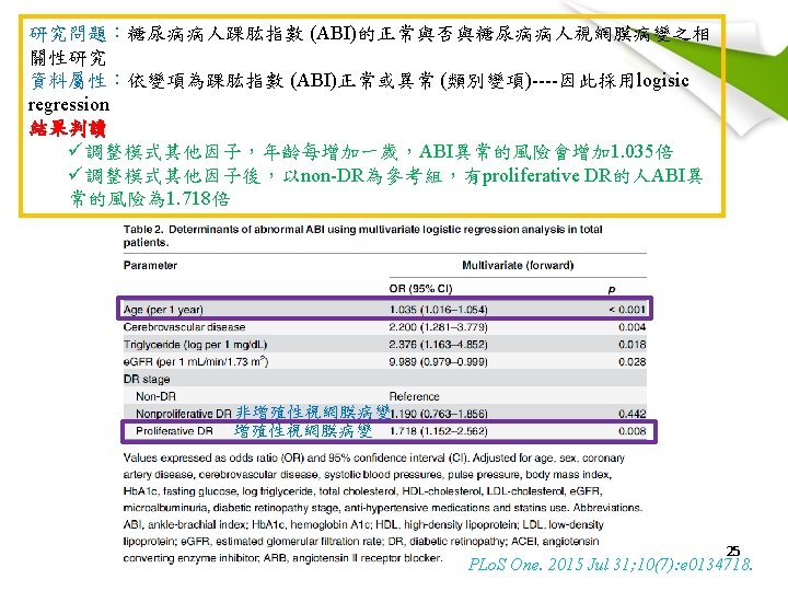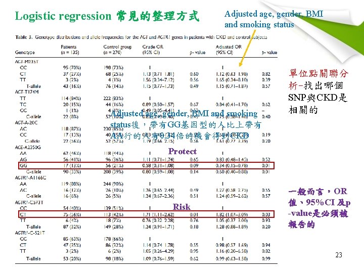 RR & OR的判讀 Binary (Dichotomous) Outcome (e. g. mortality) 依據不同之研究設計 Prospective Relative risk Odds ratio Retrospective Hazard ratio (involving time) Odds ratio 22