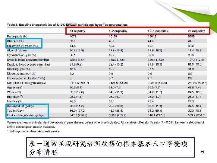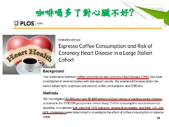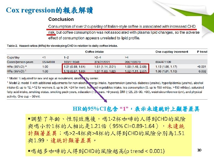 Differences in mean levels of plasma lipids between categories of coffee consumption were tested by analysis of variance (ANOVA) after adjusting for the covariates included in model 2 (above). §調整了年齡、性別等效應後,比較喝不同咖啡杯數的人,其 Total cholesterol, LDL, HDL, Triglycerides其平均值是否有差異? §結果顯示 4組喝不同咖啡杯數的人,其Total cholesterol, LDL, HDL, Triglycerides的平均值並無明顯差異 (p value 皆大於 0. 05)。 31