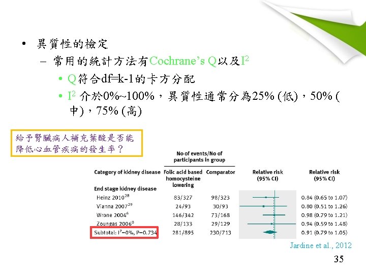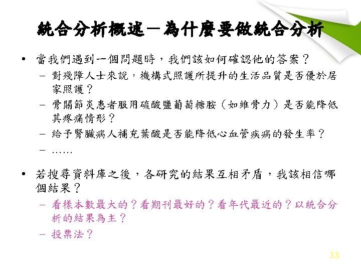 多數據層面的統合分析 (Meta-analysis) + = 32 Data from http: //library. downstate. edu/EBM 2/2100. htm