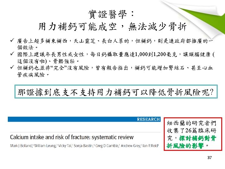 Fig 1 | Random effects models of effect of calcium supplements on risk of total fracture. 結論:目前的最佳證據並不支持 補鈣可以降低骨折風險。 38 Calcium intake and risk of fracture: systematic review. BMJ 2015; 351: h 4580.