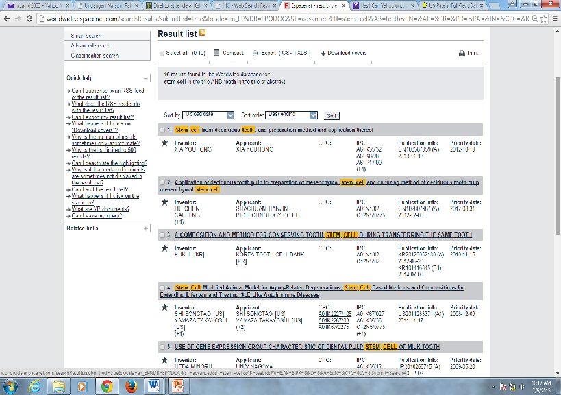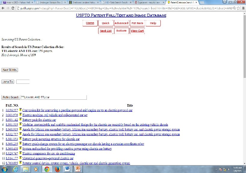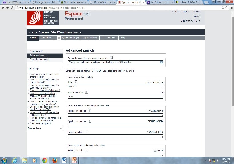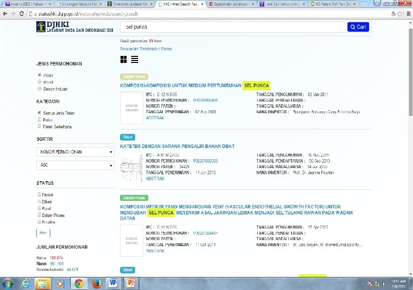 Searching Mengetahui prior art (invensi sejenis terdahulu) l Mendapatkan pembanding l Mengetahui famili paten (tanggal prioritas sama) l Mengetahui pemohon/ perusahaan/ inventor/ kompetitor l Mengetahui trend suatu invensi l