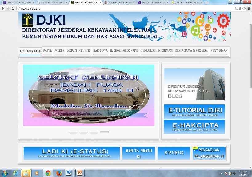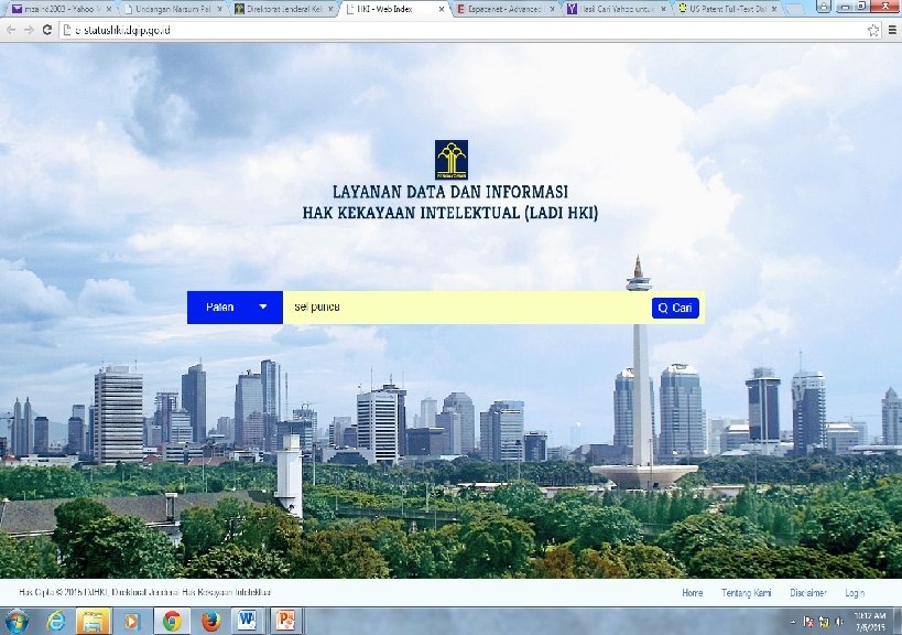 Informasi Paten diperoleh melalui Internet Searching Fee based (subscribe) Delphion (http: //www. delphion. com) Micro Patent (http: //www. micropatent. com) Free (gratis) HKI/IPDL (http: //e-statushki. dgip. go. id/) EPO (http: //worldwide. espacenet. com/advanced. Search? locale=en_EP) USPTO (http: //patft. uspto. gov/netahtml/PTO/search-bool. html) JPO (http: //www. jpo. go. jp/) Google (http: //www. google. com/patents)