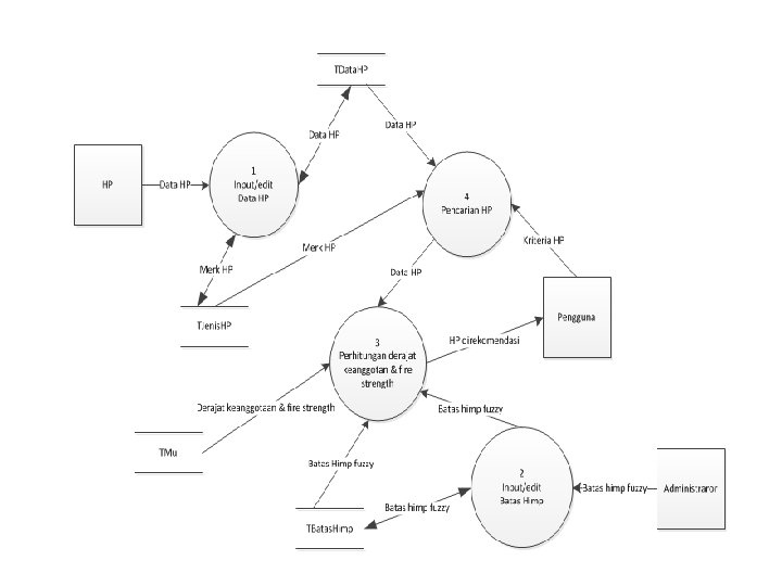 • Proses : Pemasukan dan editing data 2 HP – Data-data disimpan diambil dan diambil dari tabel Data. HP dan Jenis. HP • Proses : Pemasukan atau editing batas himpunan fuzzy – Data-data disimpan diambil dari tabel Batas. Himp • Proses : Perhitungan derajat keanggotan dan fire strength – data-data diambil dan disimpan kembali dalam tabel Mu • Proses : Pencarian HP – Pengguna menginput kriteria HP yang diinginkan, dan kemudian akan mendapatkan satu atau lebih data HP