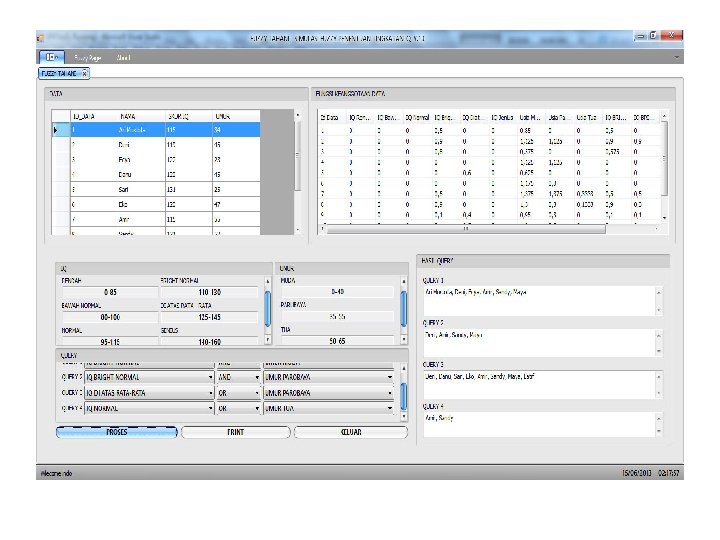 Pembentukan Query • Berdasarkan jumlah variabel yang digunakan, yaitu sebanyak 14 variabel (9 variabel fuzzy dan 5 variabel non fuzzy)