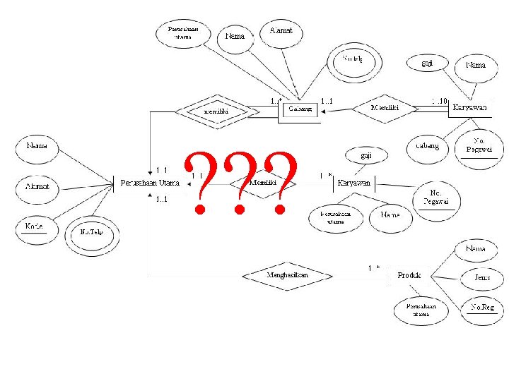 Hal Penting dalam Perancangan • Gunakan Himpunan Entitas dan atributnya untuk menggambarkan suatu sistem. Pilih entitas penting yang berhubungan dengan sistem yang dimodelkan. • Gunakan himpunan entitas dan relasi, untuk merancang himpunan relasi antar himpunan entitas • Relasi Binary dan n-ary Dimungkinakn untuk merubah n-ary ke relasi Binary dengan menambahkan satu himpunan entitas untuk menggambarkannya • Penempatan/pemilihan atribut relasi