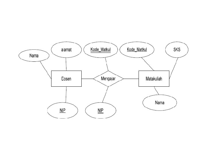 • Menentukan PK dari setiap entitas yang ada. o PK dari entitas Mahasiswa : NIM o PK dari entitas Dosen : NIP o PK dari entitas Matakuliah : Kode_Matkul • Mengidentifikasi dan menetapkan seluruh himpunan relasi diantara himpunan entitas yang ada beserta foreign key-nya Dosen dengan matakuliah berelasi secaralangsung dengan relasi mengajar, yaitu dosen mengajar matakuliah