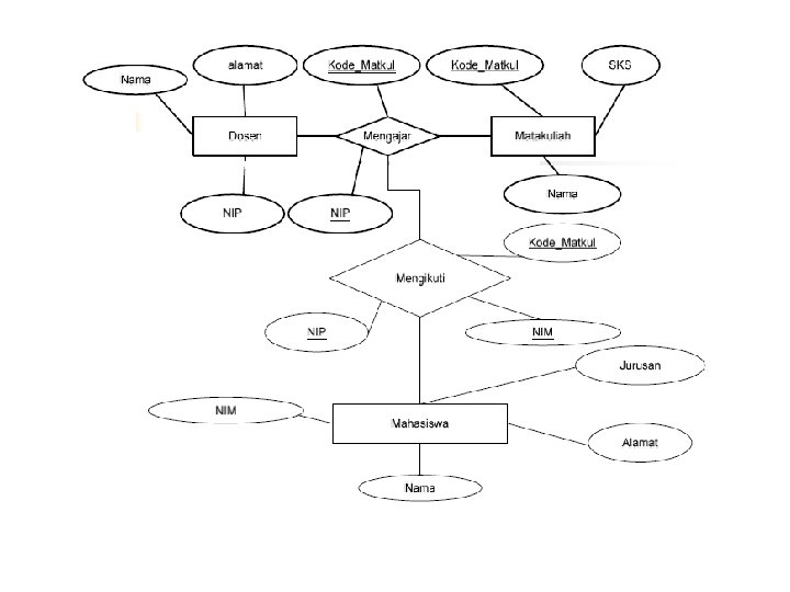 Tahap pembuatan ER • Mengidentifikasi dan menetapkan seluruh himpunan entitas yang akan terlihat. Misalnya entitas yang terlihat adalah : Mahasiswa, Dosen, Matakuliah • Menentukan atribut-atribut key dari masing himpunan entitas. o Untuk entitas Mahasiswa, atribut yang terlibat yaitu: NIM, Nama, Alamat, Jurusan. o Untuk entitas Dosen, atribut yang terlibat adalah NIP, Nama, Alamat o Untuk entitas Matakuliah, atribut yang terlibat adalah: Kode_Mat. Kul, Nama, SKS