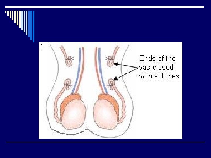 Male sterilization o Vasectomy: -division or occlusion of the vas deference prevents the passage of sperms. o Methods: 1 - Clips 2 - Diathermy 3 - Percutaneous injection of sclerosing agents or occlusive substances. o The success of the procedure is verified by the absence of sperms from two consecutive samples of ejaculate collected at least 4 weeks apart. o Contraception must be continued until confirmation of two negative semen results has been achieved and this is achieved after 16 -18 weeks of performing the vasectomy.