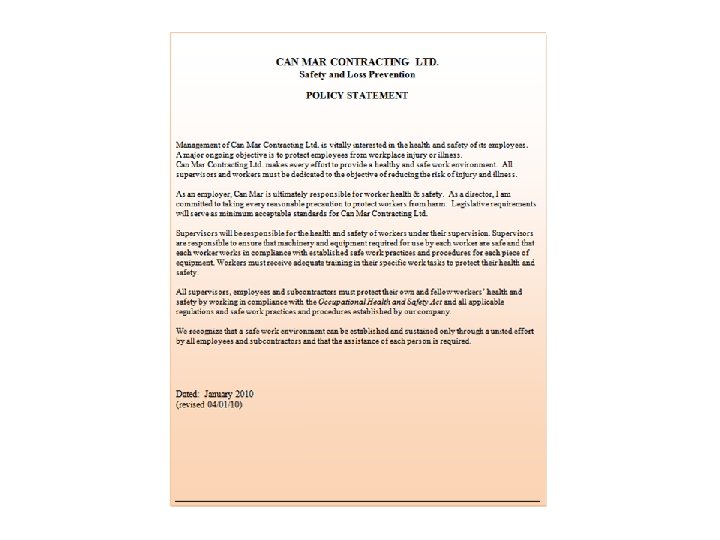 ü Ensure workers are following safe work practices as outlined in the company health & safety program. ü Ensure all necessary personal protective equipment is worn and maintained in good condition. ü Implement company disciplinary policy for any worker or sub-trade who does not comply with health an safety requirements. ü Ensure health & safety representative(s)’s recommendations are presented to the Joint Health & Safety Committee.