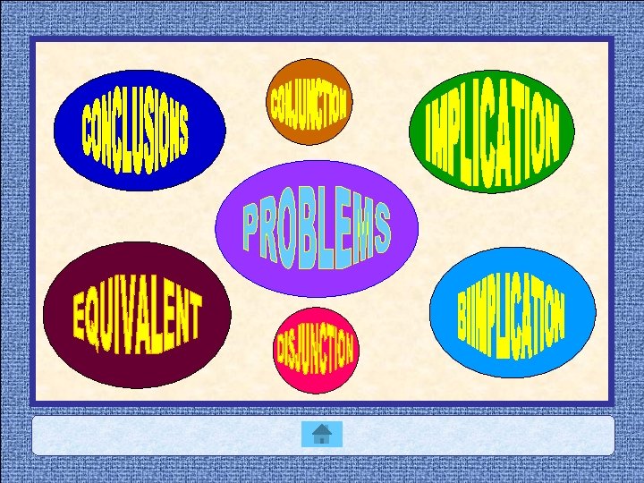 CONJUNCTION EXERCISES Find the truth value form these conjunction ! 1. sin 2 x = 1 + cos 2 x and cos 60 = ½ 2. 2 is prime number even tough 2 is even. 3. - 3 is whole number but – 3 is greater than 0. 4. 2 + 8 = 10 and log 0 = 1 TO PROBLEMS MENU