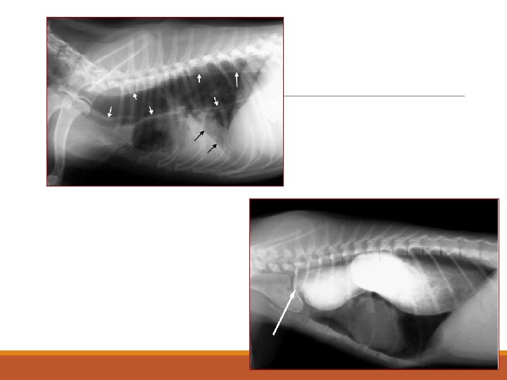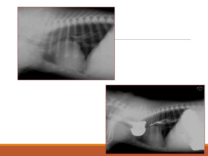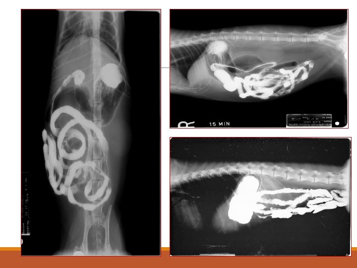 Gastrography Indications ◦ Suspected gastric wall lesion ◦ Gastric location ◦ Pyloric obstruction (check on fluoroscopy) Procedure ◦ Double contrast study (barium + air) ◦ Good for gastric mucosa ◦ Single contrast (either barium or air-pneumogastrogram) ◦ Barium: good for gastric motility ◦ Air: good foreign body Interpretation ◦ Position ◦ Rugal folds ◦ Motility (gastric emptying) (follow with fluoroscopy)