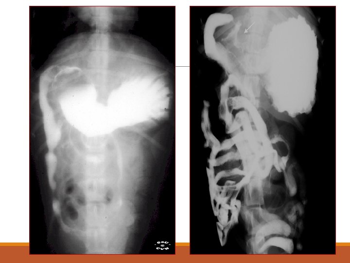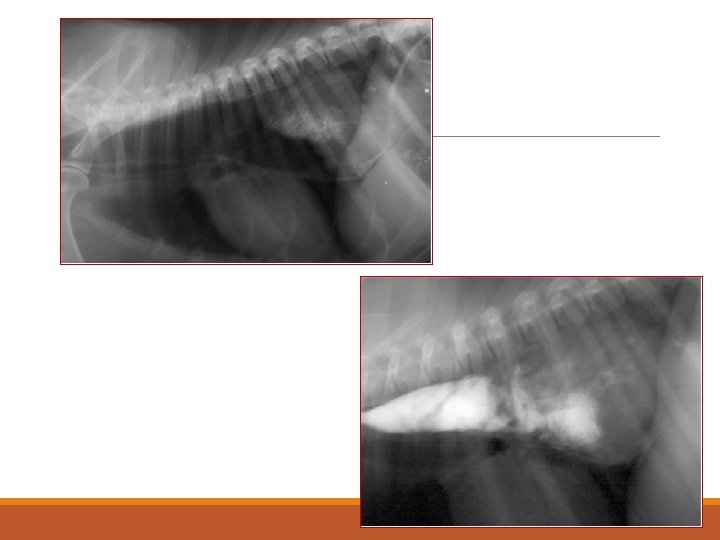 Contrast studies for the GI tract Esophagogram, esophagram, esophogram ◦ Indications: ◦ Suspected esophageal disease ◦ Confirm questionable findings on survey rads ◦ Esophageal motility ◦ Procedure ◦ Survey rads ◦ Sedation not recommended (Acepromazine) ◦ Interpretation ◦ No distention, you can see the bolus ◦ Longitudinal folds and herringbone pattern (cats)