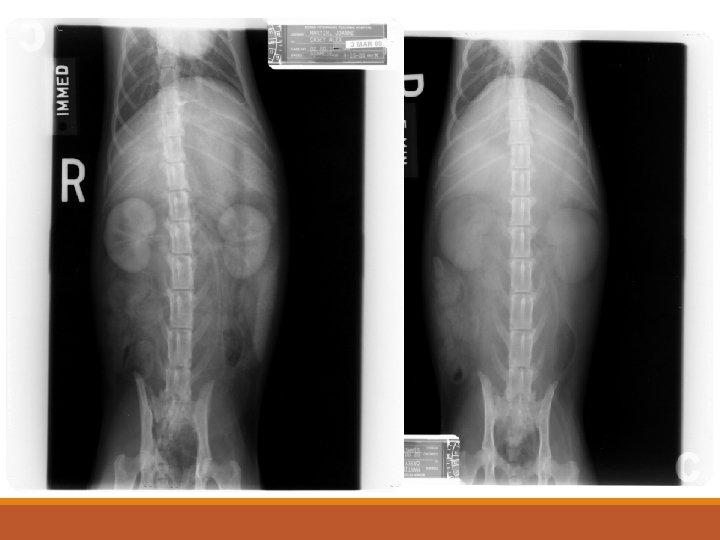 Retrograde cystography • Negative contrast cystography Catheterise the bladder (using sterile technique) Drain all the urine Instill air or gas into the bladder until it becomes slightly turgid (judged by palpation of the bladder through the abdominal wall) Take lateral and ventrodorsal radiographs