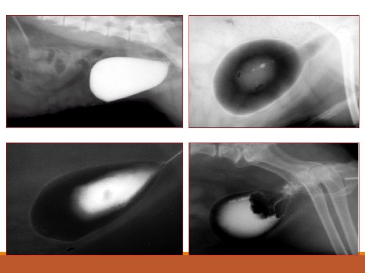 Cystography Indications ◦ Suspected bladder disease ◦ Caudal abdominal mass ◦ Bladder rupture ◦ Persistent dysuria /hematuria /stranguria ◦ Congenital anomalies Procedure ◦ 24 hour fast – enema ◦ Empty bladder ◦ Four views ◦ Positive contrast/ Double contrast ◦ Negative contrast (pneumocystogram)