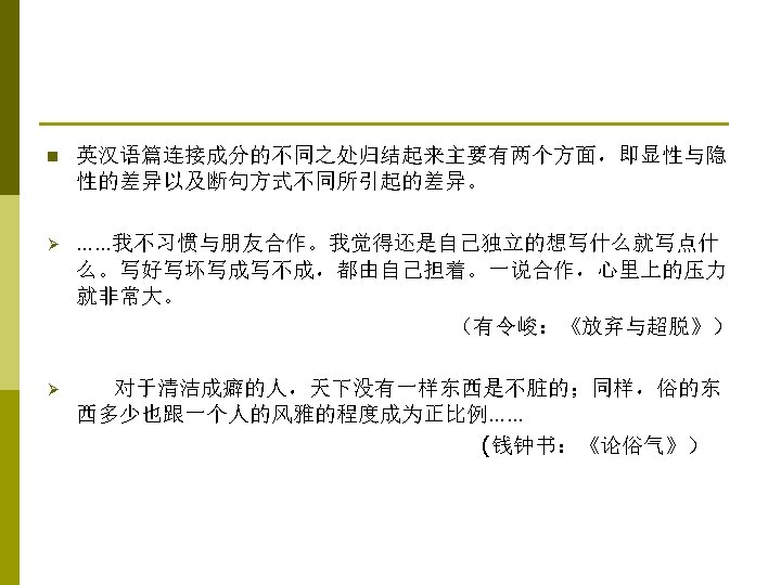 n n Ø Ø Similarities in Chinese and English: There are some similarities in syntax, look at the following examples: 一朝被蛇咬,三年怕井绳。 Once bitten, twice shy. 眼不见,心不烦。 Out of sight, out of mind.