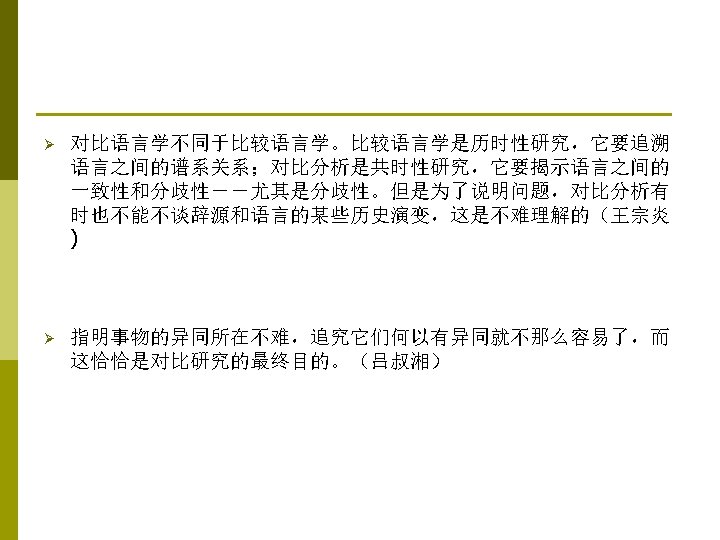 n Conversely, contrastive linguistics involves a synchronic study of two unrelated languages so as to find out the dissimilarities in phonetic, grammatical and rhetoric aspects. n The former aims mainly at the homogeneity while the latter mainly at the heterogeneity. Ø 对比语言学是共时的研究。这就是说,我们所要研究的对象,是语言 在某一发展阶段的状态,而不是语言的演变。这将对比语言学与历史 比较语言学和语言发展史的研究区别开来。(许余龙)