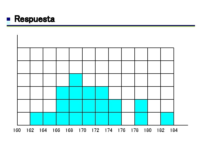 4. Histograma Ejercicios l Haga una histograma con los datos que se encuentran en la tabla. l. Al hacer el histograma, suponga la estatura promedia. Nombre Estatura (cm) Alvaro 175. 2 Andrés 167. 3 Augusto 172. 9 Cesar 169. 4 Diego 163. 4 Efren 182. 1 Fabio 179. 6 Fernández 169. 5 German 172. 1 Gustavo 167. 5 Nombre Estatura (cm) Juan 167. 4 Luis 165. 3 Martín 170. 2 Mauricio 169. 4 Miguel 168. 4 Nicolas 174. 1 Oscar 171. 5 Roberto 172. 8 Santiago 171. 2 Sebastián 179. 6