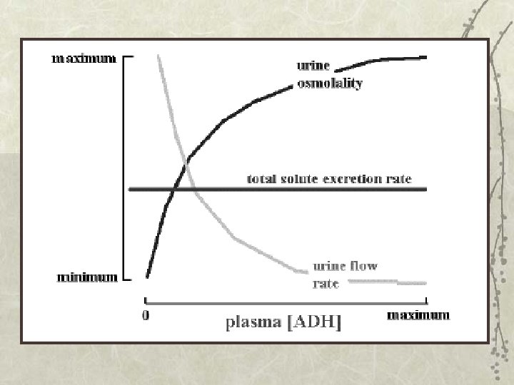 When ADH is released from the posterior pituitary it causes the kidney to produce urine that is high in osmolality and low in volume. In the absence of ADH the kidney tends to produce a large volume of urine with low osmolality. Total solute excretion is relatively constant over a wide range of urine flow rates and osmolalities.