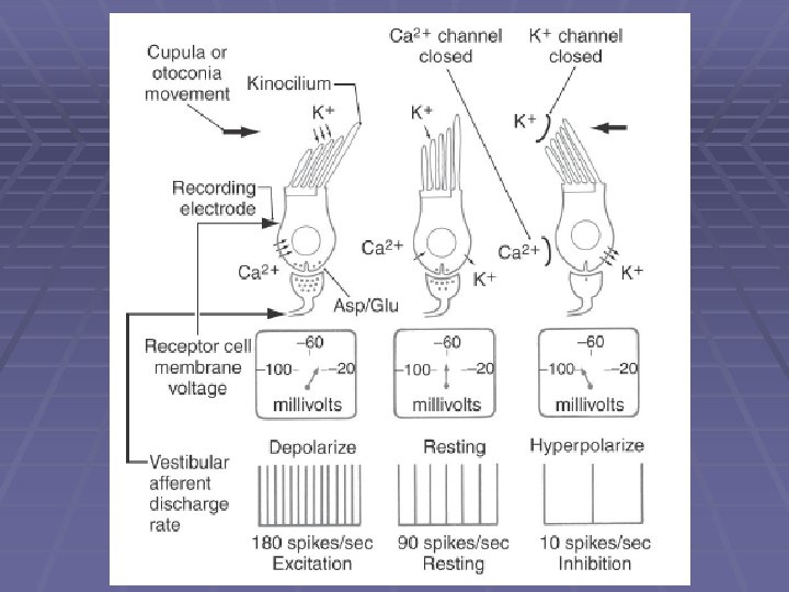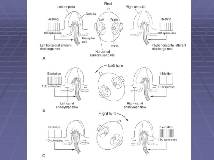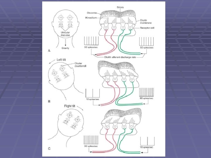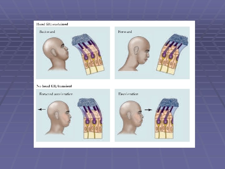 Benign Paroxysmal Positional Vertigo § common clinical disorder. § condition characterized by brief episodes of vertigo that coincide with particular changes in body position. § pathophysiology poorly understood. § posterior canal abnormalities are implicated. § otoconia crystals in the utricle may separate from the otolith membrane and become lodged in the cupula, causing abnormal cupula deflections. AND/OR partial inflammation of cranial nerve VIII