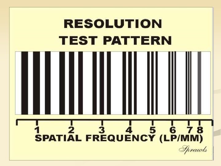 2 principal characteristics of any image are Spatial & Contrast Resolution n Spatial resolution Resolution is the ability to image two separate objects and visually distinguish one from the other n Spatial resolution is the ability to image small objects that have high subject contrast (eg. bone-soft tissue interface, calcified lung nodules) n Determined by focal-spot size and other factors that contribute to blur n Diagnostic x-ray has excellent spatial resolution. It is measured in line pairs per mm. n