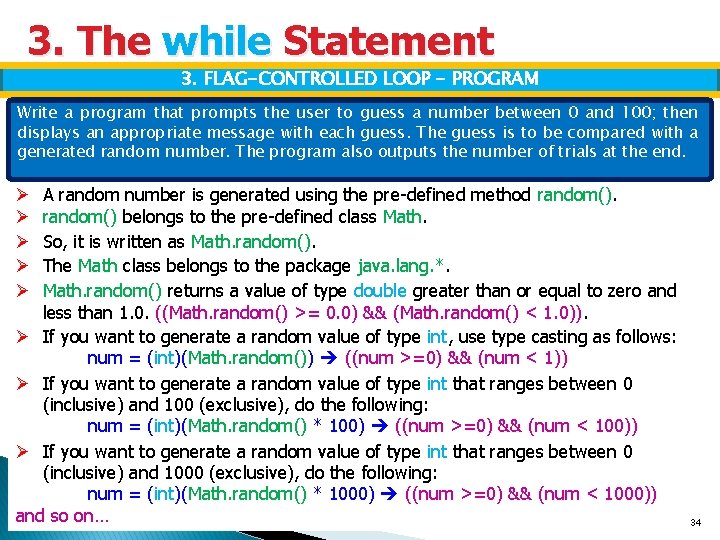 3. The while Statement 3. FLAG-CONTROLLED LOOP - PROGRAM Write a program that prompts the user to guess a number between 0 and 100; then displays an appropriate message with each guess. The guess is to be compared with a generated random number. The program also outputs the number of trials at the end. A random number is generated using the pre-defined method random() belongs to the pre-defined class Math. So, it is written as Math. random(). The Math class belongs to the package java. lang. *. Math. random() returns a value of type double greater than or equal to zero and less than 1. 0. ((Math. random() >= 0. 0) && (Math. random() < 1. 0)). Ø If you want to generate a random value of type int, use type casting as follows: num = (int)(Math. random()) ((num >=0) && (num < 1)) Ø If you want to generate a random value of type int that ranges between 0 (inclusive) and 100 (exclusive), do the following: num = (int)(Math. random() * 100) ((num >=0) && (num < 100)) Ø If you want to generate a random value of type int that ranges between 0 (inclusive) and 1000 (exclusive), do the following: num = (int)(Math. random() * 1000) ((num >=0) && (num < 1000)) and so on… Ø Ø Ø 34