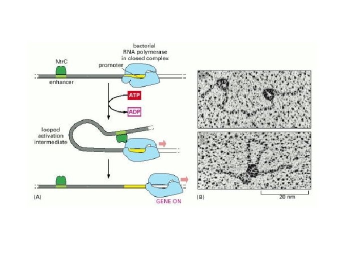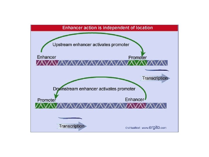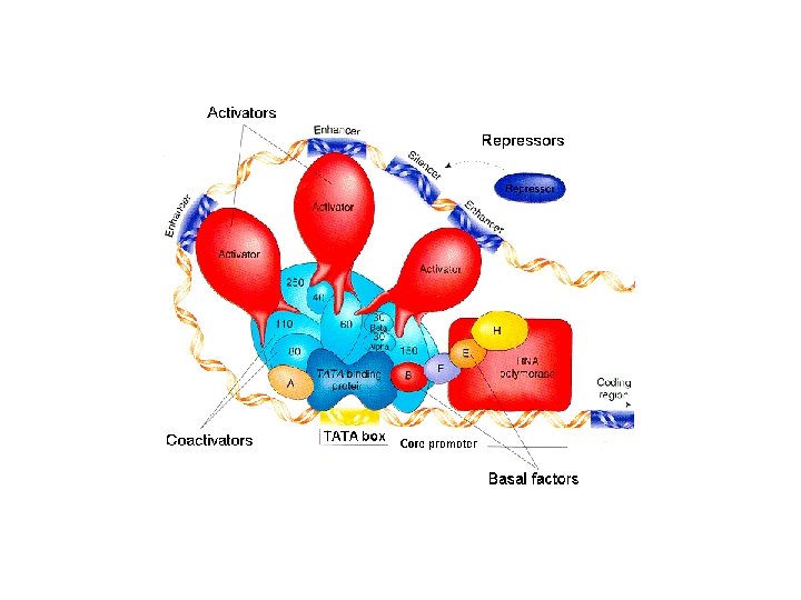 Procariotos x Eucariotos • Em procariontes, o estado básico de um gene é “ligado”, a menos que haja uma proteína reguladora no sítio promotor • Em eucariontes, o estado básico de um gene é “desligado”, e a RNA polimerase e os fatores de transcrição não podem ligar-se ao promotor na ausência de proteínas reguladoras