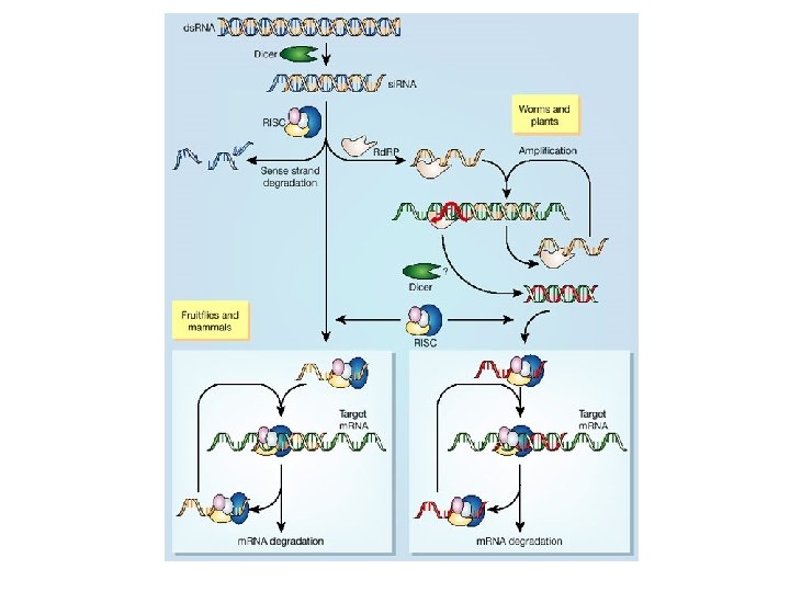 Em Vermes e plantas RISC - RNA-induced silencing complex -Distingue entre a fita sense e non-sense. A sense (azul) é degradada. A antisense é submetida à replicação pela RNA-dependent RNA polymerase (Rd. RP) A Rd. RP produz dupla fita, que é reconhecida pelo RISC, que promove a degradação do m. RNA
