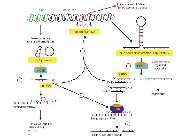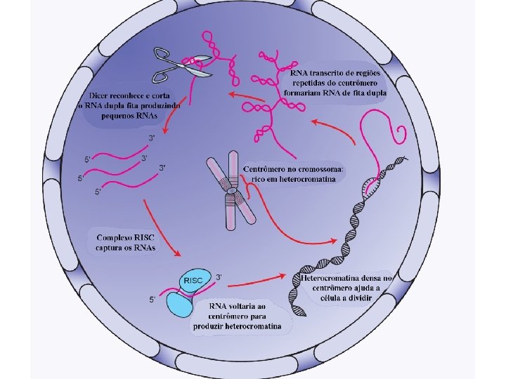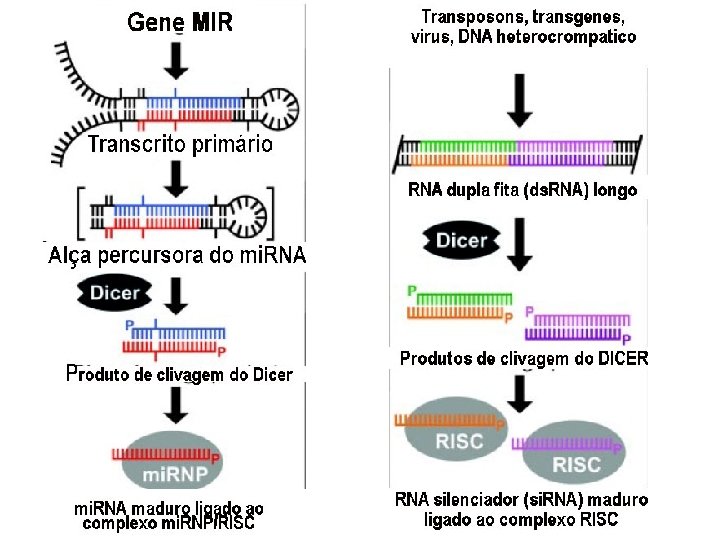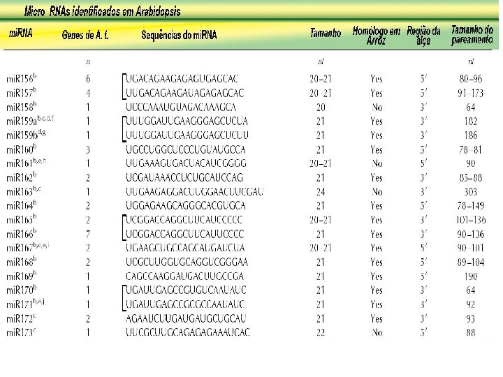 RNA curto de interferência (si. RNA) Dupla fita Micro RNA (mi. RNA) Perfeitamente complementar ao RNA alvo Direciona a clivagem endonucleolítica RNA dupla fita perfeitamente ou quase perfeitamente pareado Não conservado entre as espécies Originado de um RNA percursor de maior tamanho Cromossomal ou citoplásmico Comprimento médio de 25 nucleotídeos Fita simples Parcialmente complementar ao RNA alvo Mecanismo de ação desconhecido RNA dupla fita pareado, mas com alças Frequentemente conservado entre as espécies e filos Originado de um RNA percursor de maior tamanho Cromossomal (IGR) Tamanho médio de 70 nucleotídeos RNA curto temporal (st. RNA) Fita simples Parcialmente complementar ao RNA alvo Inibe a tradução do m. RNA dupla fita pareado, mas com alças Altamente conservado entre as espécies e filos Originado de um RNA percursor de maior tamanho Cromossomal (IGR) Tamanho médio de 70 nucleotídeos