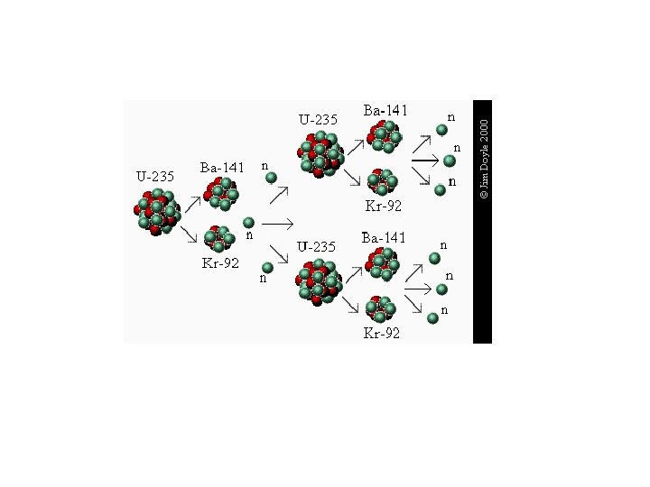 Thermal neutrons • Uranium 235 is the main fissile material which we are concerned with. • Uranium-233 and plutonium-239 can also be used but must be produced artificially • U-235, can be split by bombarding it with a slow, or thermal, neutron. • Slow neutrons are called “thermal” because their average kinetic energies are about the same as those of the molecules of air at ordinary temperatures. • krypton and barium are the major products of the process.
