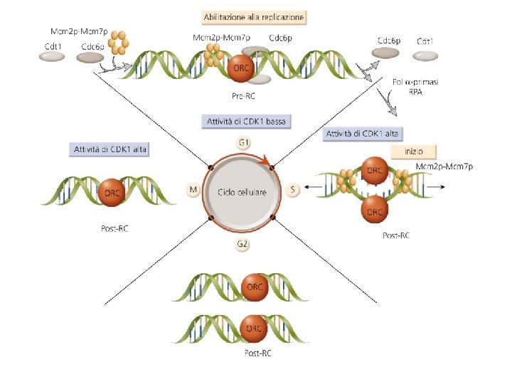 Legame tra replicazione e ciclo cellulare • La frequenza d’inizio è regolata in base alla crescita • Il completamento della replicazione è abbinato alla divisione cellulare